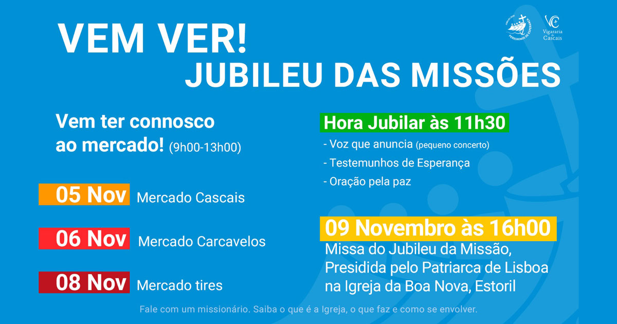 Estamos a viver o Jubileu das Missões. No próximo dia 8 de novembro, encontramo-nos no Mercado de Tires. E no dia 9 de novembro, às 16:00, na Igreja da Boa Nova, no Estoril, celebraremos a Missa do Jubileu da Missão, presidida pelo Patriarca de Lisboa, D. Rui Valério.